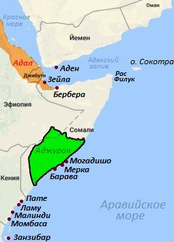 По др. сторону Африканского Рога (на входе в Красное море) в эту эпоху параллельно сосуществовало др. гос-во кочевников сомали (а также кочевников оромо и афар) под арабским династическим управлением - султанат Адал (язык сомали - "Авдал"). Название Адал впервые фиксируется в XIV в., в контексте военных действий между мусульманами (побережья сев. Сомали и региона Афар) и армией Абиссинии и её христианского короля Амдэ-Цыйона I ("Абиссиния" - европеизированная форма названия Эфиопии, от арабского "Аль-Хабаш" - историческая область в горных районах севера Эритреи и Эфиопии - родина предков народа хабеша, т.е. абиссинцев). Султанат Адал первоначально охватывал границы Эритреи и Джибути, и включал северные части Эфиопии и Сомали, с главным городом - Зейла, возникнув как центр мусульманского сопротивления против расширяющегося абиссинского христианского "царства".