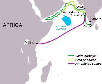 Сначала патруль взял курс на север, вдоль побережья, где захватывается большое торговое судно вблизи гуджаратского города Чол (сегодня Чол - руины в 60 км к югу от Бомбея; в 1508 г. египетские мамлюки, союзные султану Гуджарата, были побеждены португальцами в битве при Чоле; в 1521 г. начато строительство форта на южном берегу реки Кундалика; позже Чол стал частью Северной провинции Португальской Индии, которая к середине XVII в. протянулась на 200 км вдоль побережья к северу, до города Даман). После патруль уходит к Красному морю, чтобы заполучить больше наживы. Около 5 арабских торговых судов были захвачены этим патрулём весной 1503 г. в Аденском заливе. В конце апреля эскадра Содре встаёт на якорную стоянку у о-вов Курия-Мурия (5 гранитных островов в 40 км от побережья Омана), где позже в мае во время бури 2 "нау" с братьями Содре потерпели крушение (перед этим имел место конфликт между капитанами всвязи с дележом награбленного). В последствии 3 оставшихся корабля с Перо ди Атаиде (по прозвищу "Морской чёрт") в качестве нового выбранного командующего патрулём отправились обратным курсом в Индию. Этот обратный путь против ветров был тяжким и долгим. Разбитый патруль доковылял до стоянки на острове Анжедива где-то летом, через 4 дня там их встретила "потерянная" команда Антониу ду Кампу (пропустившая прошлогодний летний муссон в Малинди), они по-прежнему крепко стояли у Анжедивы, когда корабли Франсишку ди Альбукерке и Николау Коэлью (авангард "5-ой Индийской Армады") вышли туда в августе 1503 г.