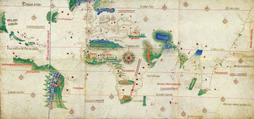 «Planisfério de Cantino» - самая ранняя из сохранившихся и находящаяся в открытом доступе карт, прорисовывающая мир в привычных силуэтах материков, с доскональной проработкой побережья Атлантического и Индийского океанов, включая фрагмент бразильского берега, изученный Педру Кабралом в 1500 г. «Planisfério de Cantino» с удивительной точностью и детализацией отображает португальские географические открытия (а также испанские в Карибском море) в процессе их появления. Название дано по имени Альберто Кантино, агента герцога города Феррара, который тайно заказал скопировать её с оригинальных португальских морских карт и вывез из Португалии в Италию в 1502 г. «Planisfério de Cantino» содержит уникальные исторические данные об исследованиях и эволюции морской картографии, где абрисы берегов (Африки, частично Бразилии и Индии) соответствуют их астрономически наблюдаемым координатам, что было крайне ценно в начале XVI в., т.к. эта карта давала подробную и актуальную стратегическую информацию в то время, когда географические знания о мире проявлялись и росли быстрыми темпами.