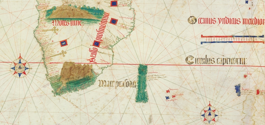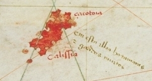 Фрагмент «Planisfério de Cantino». Западный берег Африки огорожен "падранами", возведёнными экспедициями Диогу Кана и Бартоломеу Диаша в 1480-х гг. На юге Африки - абрис Столовой горы в бухте Кейптауна, у которой первым высаживался Антониу ди Салданья, капитан "5-ой Армады", только в 1503 г. Обращает на себя внимание ряд деталей грубо не соответствующих датировке - как уже отмеченная путаница с открытиями о-вов Св. Елены и Вознесения; несоответствие с более поздними открытиями о-вов Сокотра, Цейлон и многих др., а также всего того, что южнее и восточнее Малабарского берега Индии; если и существует версия, что берегов Реюньона мог достигнуть Диогу Диаш в 1500 г., то относительно о. Амстердам известно точно, что его обнаружил спутник погибшего у филиппинского о. Мактан Фернана Магеллана - Хуан Себастьян Элькано 18 марта 1522 г., пересекая Индийский океан. И доподлинно известно, что о. Кергелен был открыт французом Ив-Жозефом де Кергеленом в 1772 г., лишь спустя 270 лет после появления самой «Planisfério de Cantino» ...