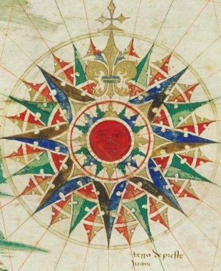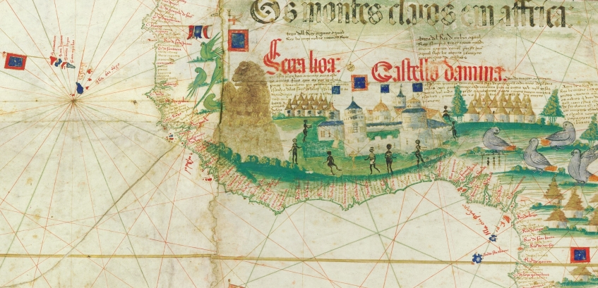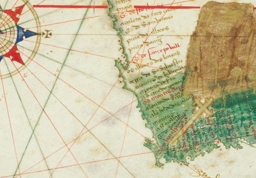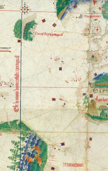 Фрагмент «Planisfério de Cantino». Острова Кабо-Верде с португальским флагом источают 32 классических румба. Гвинейский залив открывается горой Сьерра-Леоне в форме льва с португальским флагом в лапах и экзотическими африканскими птицами (неразлучники). Справа - португальский флаг торчит из устья реки Рио Муни; выше - стая двухцветных попугаев жако.