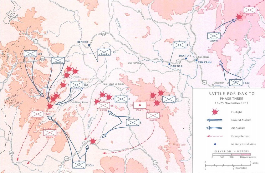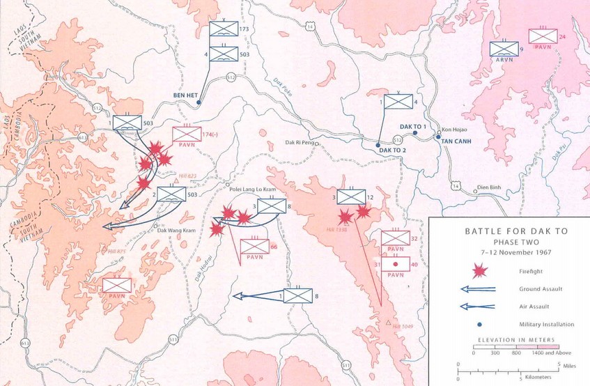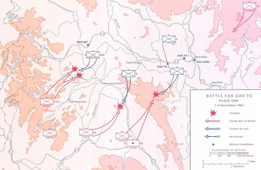 Всё это происходило перед главным событием. 18 ноября рота из числа мобильных ударных сил «Mike Force» лагеря «Dak To» во время одной из полудюжины вылазок, совершённых отрядом специального назначения капитана Джимми Л. Брэддока («Special Forces Detachment A-244»), прокладывая себе путь по восточному склону холма 875 м, вошла в соприкосновение с противником. Северо-вьетнамский 174-й полк засел в сложной системе укреплений и бункеров. «Mike Force» отступили, и на следующий день генерал Швейтер направил батальон 2/503 брать высоту. Батальон майора Джима Стевертона выдвинулся с места, где они в это время исследовали заброшенный вражеский базовый лагерь - огромный комплекс укреплений, который, если бы был приведён в действие, то представлял бы собой проблему для американцев и юж. вьетнамцев.