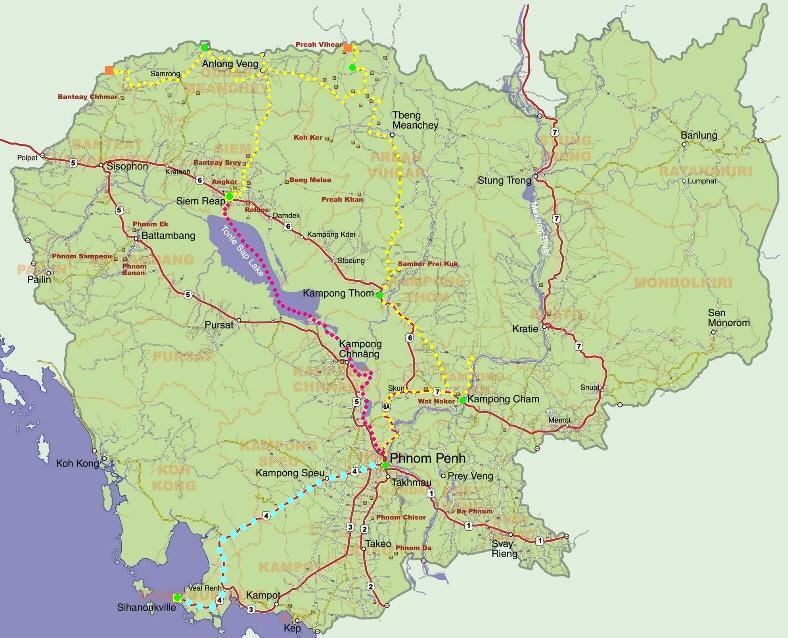 - жёлтый пунктир - маршрут прохождения на мотоциклах; - красный пунктир - путь Сием Риеп - Пномпень по воде; - голубой пунктир - путь Пномпень - Сиануквиль; - зелёные точки - места остановок на ночь; - красные квадраты - приграничные древние храмы Пря Вихеа и Прасат Мон Тхом.